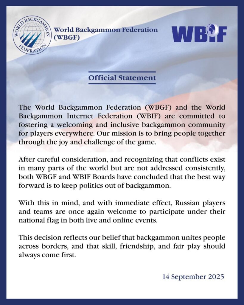 فدراسیون جهانی تخته نرد (WBGF) و فدراسیون جهانی اینترنتی تخته نرد (WBIF) متعهد به ایجاد یک جامعه تخته نرد پذیرا...
